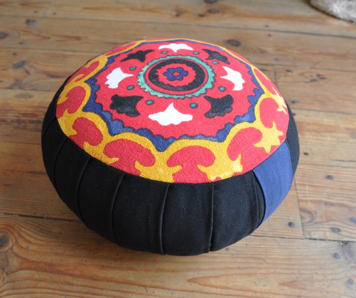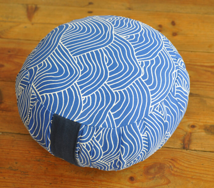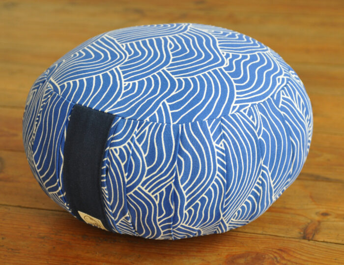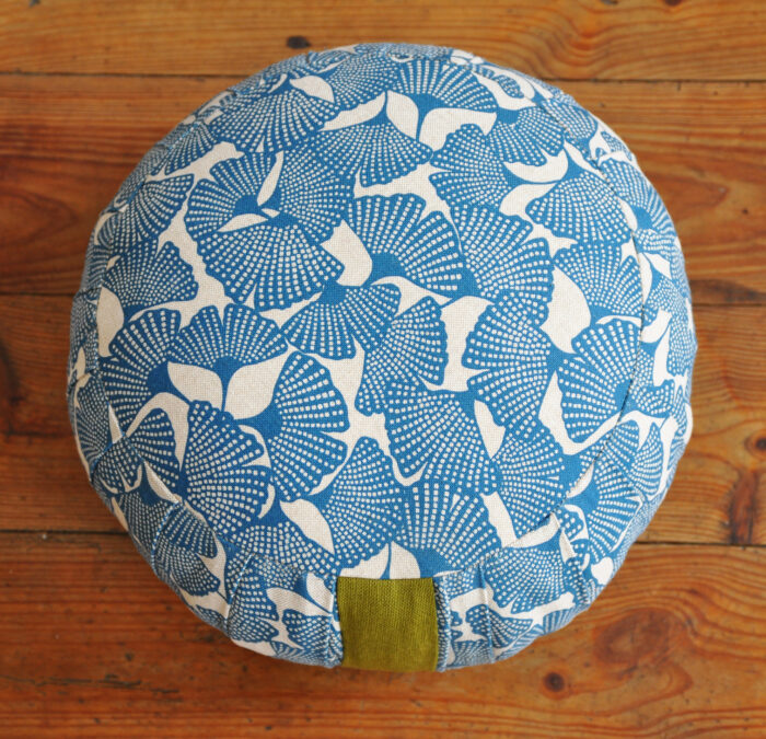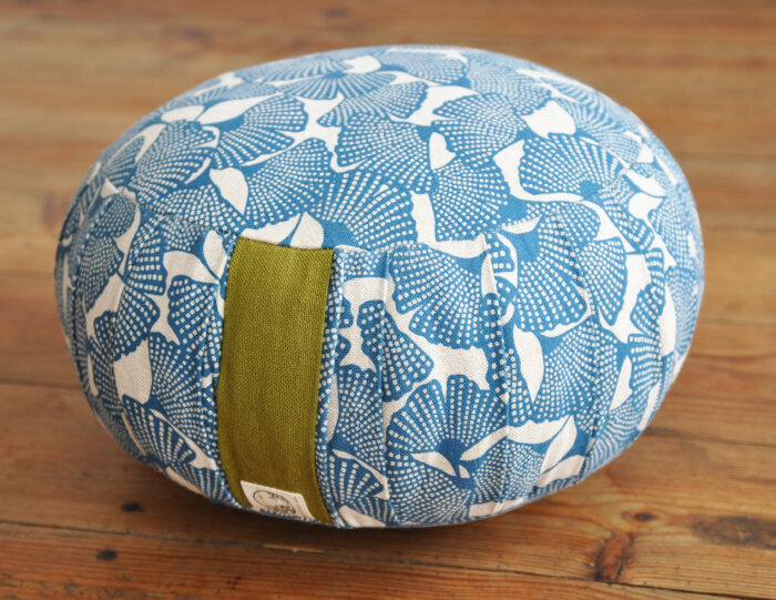 L’enveloppe du zafu est ici réalisée avec un tissu à motifs. Ces tissus de qualité sont choisis avec soin, doublés si nécessaire, neufs ou parfois d’anciens tissus chinés ici ou là… Il est possible de réaliser un zafu à motifs avec votre propre tissu : aussi bien un tissu acheté neuf ou pour transformer un tissu que vous chérissez en un coussin original et inspirant…